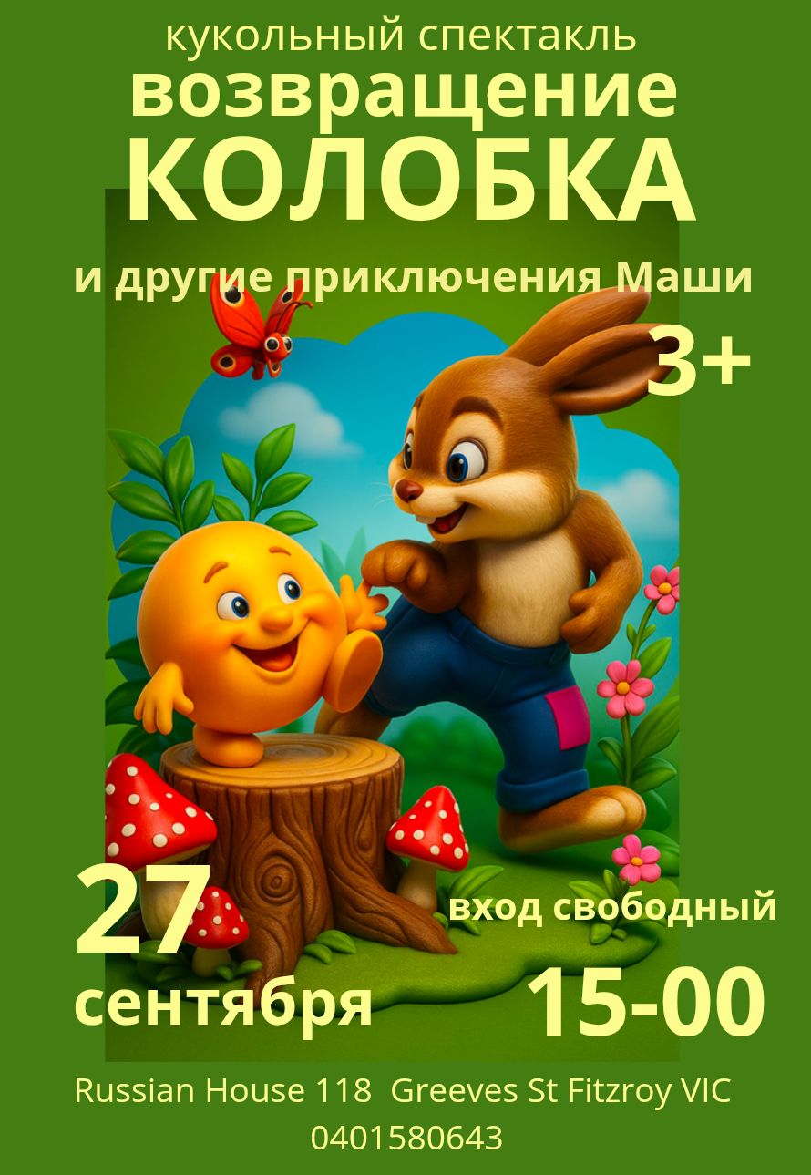 27 сентября в 3 часа ждем детей от 3 лет на кукольный спектакль "Возвращение Колобка и другие приключения Маши". Вход свободный! Начало в 3 часа
