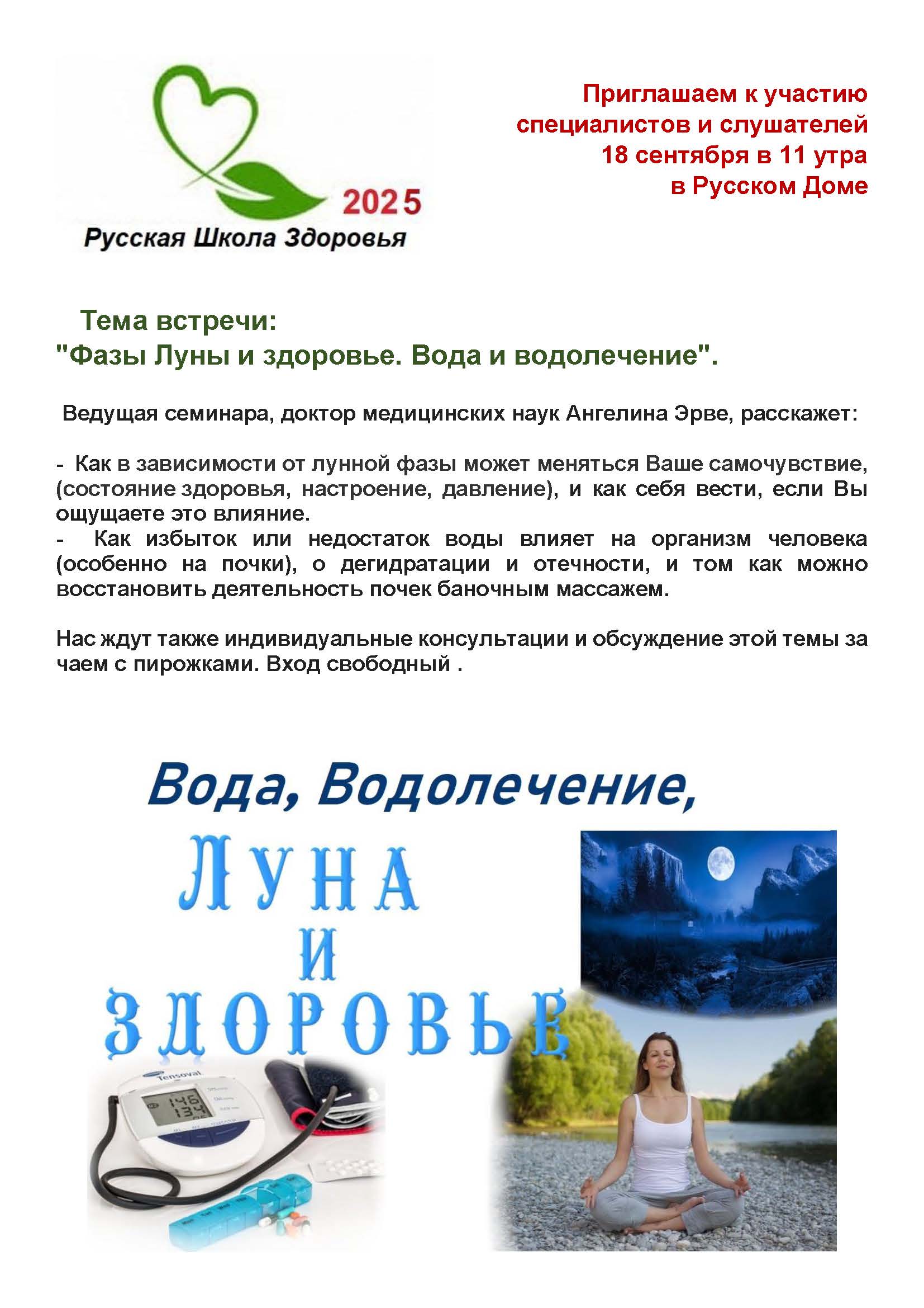 Приглашаем специалистов и слушателей 18 сентября на очередной семинар Школы Здоровья Тема "Фазы Луны и здоровье. Вода и водолечение". Вход свободный. Начало в 11 часов.