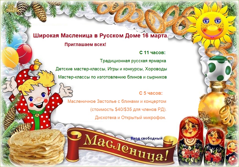 Русский Дом ждет всех на Масленицу с 10 утра до 10 вечера: выставки, мастер классы для детей и взрослых,хоровод,  концерт, застолье с блинами, дискотека, открытый микрофон